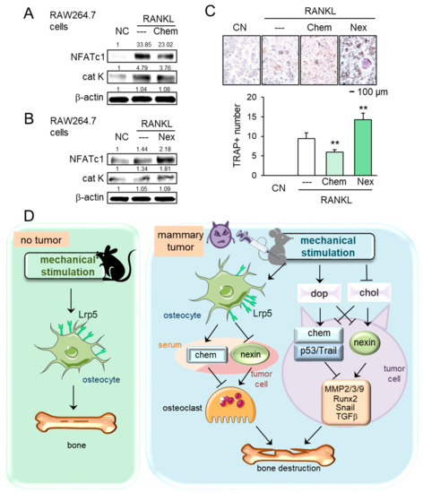 Effects of chemerin and nexin on osteoclasts, and the proposed regulatory mechanism. The double asterisk indicates p < 0.01. (A,B) Downregulation of NFATc1 and cathepsin K by chemerin and their upregulation by nexin in RANKL-stimulated RAW264.7 osteoclasts. (C) Reduction and elevation of tartrate-resistant acid phosphate (TRAP)-positive cells by chemerin and nexin, respectively. (D) Proposed regulatory mechanism for female mice in response to knee loading. Without tumor inoculation, Lrp5 in osteocytes is necessary to induce loading-driven bone formation. In the tumor-invaded tibia, mechanical loading suppresses bone destruction regardless of Lrp5 in osteocytes. The beneficial loading effects are mediated by the elevation of dopamine and the reduction in cholesterol. Chemerin and nexin act as a suppressor and promotor, respectively, to regulate oncogenic genes such as MMP2, MMP3, MMP9, Runx2, Snail, and TGFβ.
