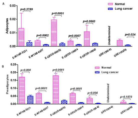 Tumor heterogeneity analysis to estimate adipocyte and preadipocyte population in lung cancer compared to normal lung tissue. (A) Fraction of adipocytes in normal healthy lungs vs. lung cancer in multiple data sets calculated using xCell. (B) Fraction of preadipocytes in normal healthy lungs vs. lung cancer in multiple data sets calculated using xCell.