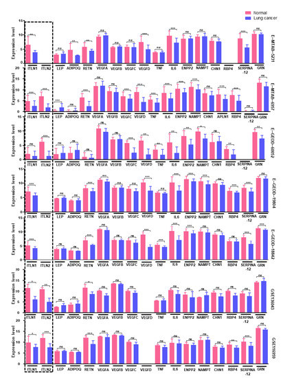 Expression levels of all adipokines in the indicated data sets. Omentin 1 (ITLN1) is significantly downregulated in lung cancer in 6 out of 7 data sets, and omentin 2 (ITLN2) is significantly downregulated in lung cancer in all 4 data sets in which it could be detected. In those 4 datasets, both ITLN1 and ITLN2 are downregulated in lung cancers. * p ≤ 0.01, ** p ≤ 0.001, *** p ≤ 0.0001.