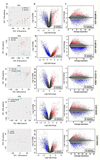 Differential gene expression analysis of data sets. (A) principal component analysis showing clustering of samples; (B) volcano plot showing differential expression of genes against false discovery rate between lung cancer and normal lungs; (C) MA plot (M: log ratio, A: Mean average) showing average expression of genes against fold change between lung cancer and normal lungs in respective data sets indicated to the right.