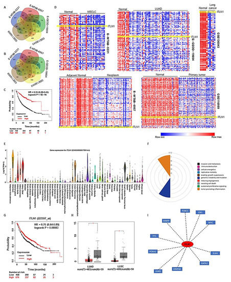 Overlapping differentially expressed genes (DEGs). (A) Venn diagram showing a number of differentially downregulated genes in lung cancer compared to the normal lung in all data sets. (B) Venn diagram showing a number of differentially upregulated genes in lung cancer compared to the normal lung in all data sets. (C) Kaplan Meier (KM) plot showing overall survival of lung cancer patients expressing high and low levels of the 82 DEGs. (D) Respective heat maps showing 82 commonly downregulated genes in all datasets. (E) Gene expression levels of ITLN1 in different normal tissues from the Genotype-Tissue expression (GTEx) portal. (F) Role of ITLN1 in cancer from cancer hallmarks analytics tool. (G) KM plot showing overall survival of lung cancer patients with high and low ITLN1 expression. Elevated ITLN1-associated with a better prognosis in lung cancer. (H) ITLN1 expression levels in different subtypes of lung cancer compared to normal lungs from Gene expression profiling interactive analysis (GEPIA) (I) ITLN1 associated transcription factors from NetworkAnalyst. LUAD: lung adenocarcinoma; LUSC: lung squamous cell carcinoma.