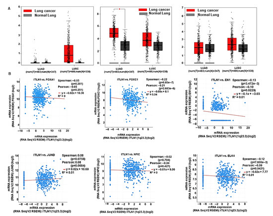 ITLN1 negatively correlates with oncogenic transcription factors in lung cancer. (A) Expression level of ITLN1 associated transcription factors in lung cancer compared to normal lungs. (B) Spearman correlation of ITLN1 with associated transcription factors from TCGA. LUAD: lung adenocarcinoma; LUSC: lung squamous cell carcinoma.