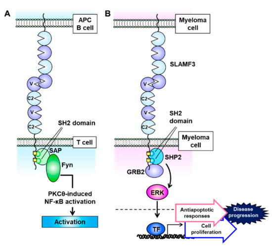 Notably, MM cell lines do not express SAP and EAT-2, and therefore SLAMF3 signaling pathway activity is closely related to the recruitment of the adaptor proteins SHP2 and growth factor receptor-bound protein 2 (GRB2), which are expressed in most cell lines [63]. SHP2 and GRB2, respectively, bind to the two ITSMs and a C-terminal end motif (amino acid sequence: YENE) in the cytoplasmic domain of SLAMF3 and interact with each other (Figure 3B) [63]. When expressed on MM cells, SLAMF3 transmits MAPK/ERK signals mediated by the recruitment of SHP2 and GRB2 via self-ligand interactions and subsequently promotes antiapoptotic responses and cell proliferation (Figure 3B) [63]. The GRB2-mediated signaling cascade promotes cell proliferation and survival in multiple types of malignancy [65]. GRB2 is expressed much more strongly in plasma cells from MM patients relative to healthy controls, despite nearly equal SLAMF3 expression levels [63]. These results suggest that the SLAMF3–SHP2–GRB2 signaling pathway strongly promotes the aggressive MM cell phenotype.