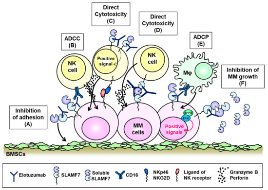 Treatment with a SLAMF7-targeted siRNA or anti-SLAMF7 antibody (HuLuc63) was shown to inhibit the adhesion of MM cells to BM stromal cells, which reduced the survival of MM cells (Figure 4A) [80]. Further, HuLuc63 exhibited antimyeloma activity against MM cells via NK cell-mediated ADCC in vitro and in vivo [29,80]. Elotuzumab (previously known as HuLuc63), a humanized anti-SLAMF7 monoclonal antibody, exhibits potent tumor-killing activity against MM cells and has been promoted to clinical development [81,82]. Elotuzumab recognizes an epitope within the membrane proximal IgC2 domain of SLAMF7 [83] and exhibits two main mechanisms of action. First, elotuzumab binds primarily to SLAMF7 on MM cells and subsequently kills these cells through Fc-gamma receptor (FcγR) III (CD16)-dependent ADCC mediated by NK cells. Second, elotuzumab directly activates NK cells to eliminate MM cells (Figure 4B,C) [81,83,84]. In the latter mechanism, the binding of elotuzumab to NK cells co-stimulates calcium signaling responses triggered through the NK receptors NKp46 and NKG2D in a CD16-independent manner [85]. Pazina et al. have recently reported that elotuzumab enhanced the SLAMF7–SLAMF7 interactions between NK cells and MM cells in a CD16-independent manner, which induced the cytotoxicity of the former toward the latter population (Figure 4D) [86]. Furthermore, Kurdi and colleagues reported a new mechanism wherein elotuzumab exhibited antimyeloma effects via macrophage-mediated antibody-dependent cellular phagocytosis (ADCP), which was triggered by the Fc- and CD16-dependent interaction of elotuzumab with macrophages (Figure 4E) [87]. However, elotuzumab does not trigger CDC against MM cells and cannot directly induce MM cell death [83]. Despite the promising effects of elotuzumab in preclinical studies, monotherapy with this immunotherapeutic agent failed to elicit objective responses in patients with relapsed/refractory MM due to NK-cell exhaustion in the tumor microenvironment [88].
