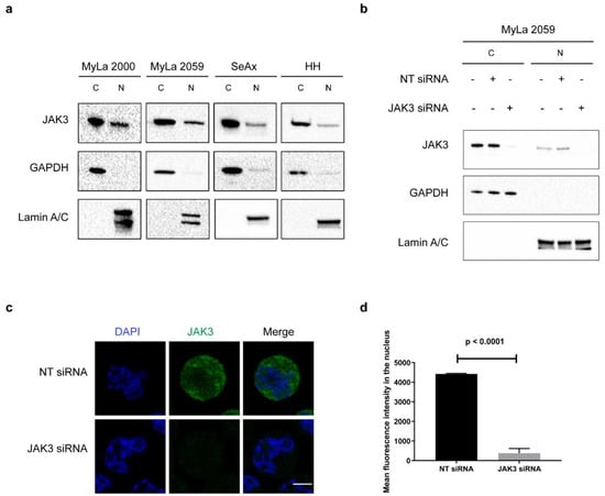 Nuclear localization of JAK3 has recently been observed in HIV-infected CD4+ T cells [32] which prompted us to hypothesize that malignant CD4+ T cells from CTCL patients may also display ectopic expression and function of JAK3. Accordingly, we performed Western blotting (WB) on isolated cytoplasmic and nuclear extracts from the malignant cell lines MyLa 2000, MyLa 2059, SeAx, and HH. As shown in Figure 1a, JAK3 was expressed in the nucleus of all of four tested malignant cell lines (Figure 1a). We next performed transient knockdown of JAK3 using siRNA against JAK3 to validate the specificity of the anti-JAK3 antibody prior to analysis for nuclear JAK3 expression by immunofluorescence. As shown in Figure 1b and Figure S1, siRNA treatment for 48 h almost completely abolished nuclear JAK3 expression as judged from WB on cytoplasmic and nuclear extracts from the MyLa2059 and MyLa 2000 respectively. In parallel, we performed immunofluorescence in MyLa2059. JAK3 expression was almost completely abolished by siRNA-mediated JAK3 knock-down (Figure 1c) when compared with cells treated with the scrambled siRNA control (Figure 1c). JAK3 was expressed in the nucleus as judged from the merged images of nuclear and JAK3 staining (Figure 1c), and almost completely absent following siRNA mediated JAK3 knockdown (Figure 1c). Quantification of mean fluorescence intensity (MFI) confirmed the nuclear expression of JAK3 in MyLa 2059, which was profoundly inhibited following siRNA mediated JAK3 knockdown (Figure 1d, p < 0.0001). We also performed immunofluorescence staining in MyLa 2000 and verified the nuclear expression of JAK3 (Figure S1).
