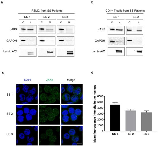 JAK3 is expressed in the nucleus in cells from SS patients. (a) Immunoblot shows JAK3 expression in the cytoplasmic and nuclear extracts of PBMC isolated from SS patients. (b) Immunoblot shows JAK3 expression in the cytoplasmic (C) and nuclear extracts (N) of CD4+ T cells isolated from SS patients. (c) Immunofluorescence (IF) confirming JAK3 expression in the nucleus of CD4+ T cells isolated from SS patients. Scale bar = 5 μm. (d) Mean fluorescence intensity of JAK3 calculated in the nucleus after IF. Error bar represents standard error of mean. Display settings were adjusted after image analysis using Image J and the same settings were propagated in all samples.