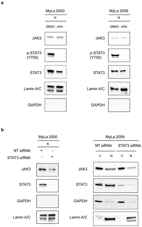 Once we had confirmed nuclear expression of JAK3 in CTCL, we asked whether JAK3 nuclear expression was affected by JAK3 kinase activity. Accordingly, we inhibited JAK3 activity in malignant T cell lines with the JAK inhibitor Tofacitinib citrate [33]. As an in vivo read-out of JAK3 kinase activity, we measured STAT3 tyrosine phosphorylation, a key down-stream effect of JAK in malignant T cells [34]. The expression level of JAK3 in the nucleus remained largely unchanged despite inhibition of JAK3 kinase activity, as demonstrated by a profound inhibition of phosphorylated STAT3 (Figure 3a). These findings suggests that JAK3 kinase activity is not essential for its nuclear expression. Next, we tested the hypothesis that nuclear expression of JAK3 may be influenced by STAT3. To this end, we transiently knocked down STAT3 in MyLa 2000 and MyLa 2059 using siRNA against STAT3, and after 48 h, we isolated cytoplasmic and nuclear extracts prior to WB. STAT3 knockdown strongly inhibited STAT3 expression in both the cytoplasmic and the nuclear fraction whereas the expression of the cytoplasmic house-keeping protein GAPDH and the nuclear protein Lamin A/C was largely unaffected (Figure 3b). STAT3 knockdown induced a modest inhibition of nuclear JAK3 expression (Figure 3b) suggesting that JAK3 expression in the nucleus was partly dependent on STAT3.