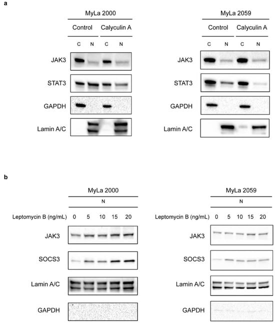 CRM1 inhibitor but not PP2A inhibitor has an effect on nuclear translocation of JAK3. (a) Immunoblot shows JAK3 expression in the cytoplasmic (C) and nuclear (N) extracts of MyLa 2000 (left) and MyLa 2059 (right) after treatment with either DMSO (Control) or 80 nM Calyculin A for 1 h. (b) Immunoblot shows JAK3 expression in the nuclear extracts (N) from MyLa 2000 (left) and MyLa 2059 (right) after treatment with mentioned concentrations (0–20 ng/mL) of Leptomycin B for 3 h.