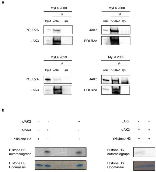 Next, we addressed whether JAK3 interacts with other nuclear proteins. We hypothesized RNA Polymerase II could be a target as JAK3 was shown to interact with RNA Polymerase II in NK/T-cell lymphoma [45]. Accordingly, we performed co-immunoprecipitation (co-IP) in MyLa2000 and MyLa 2059 and found that JAK3 interacts with POLR2A, the catalytic subunit of RNA Polymerase II (Figure 5a). We verified this interaction by reverse co-IP (Figure 5a) supporting the hypothesis that JAK3 may play a role in nuclear signaling in malignant T cells. As JAK1 and JAK2 modulate epigenetic regulation of gene transcription through tyrosine phosphorylation of the histone protein H3 in leukemic- and B cell lymphoma- cell lines [30,31], we performed in vitro kinase assays to address whether JAK3 was also able to phosphorylate Histone H3. As shown in Figure 5b, recombinant JAK3 induced phosphorylation of recombinant Histone H3, an effect that was inhibited by the JAK inhibitor Tofacitinib citrate. These findings indicated that JAK3 (like JAK1 and JAK2) has the capacity to phosphorylate Histone H3. Further studies are warranted to address whether JAK3 associates with and phosphorylate Histone H3 in vivo and how this might modulate epigenetic regulation and transcription in malignant T cells.
