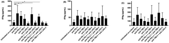 IFNγ secretion in supernatant collected after co-culturing peripheral blood mononuclear cells (PBMC) with malignant pleural mesothelioma (MPM) cells and treatment with immune checkpoint (IC) blocking antibodies (Abs). The amount of IFNγ present in supernatant collected after 72 h was determined using an ELISA assay. Supernatant was collected from co-cultures of the MPM cell lines (A) NCI-H2818, (B) NCI-H2795, and (C) NCI-H2731 with human PBMC. The experiments were repeated three times with three different PBMC donors (n = 3). Results were compared to our negative and positive controls. Error bars represent the standard deviation. * p < 0.05, ** p < 0.01: significant difference in IC expression.