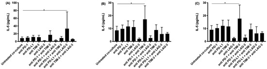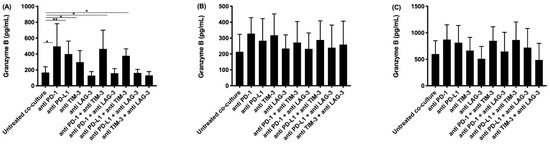 IL-10 enhances the proliferation and survival of B-cells. It can also act as an anti-inflammatory molecule by downregulating the expression of co-stimulatory molecules on immune cells. As noted for IFNγ, granzyme B, and IL-2, the highest concentrations of IL-10 were observed in the supernatant of co-cultures treated with anti PD-1 and anti PD-L1 monotherapies, and their combination with TIM-3 blockade (Figure 5).