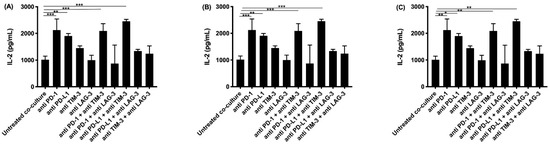 IL-2 is secreted by activated T-cells, and stimulates the differentiation of regulatory T-cells, effector T-cells, and memory T-cells. It regulates immune responses through a negative and positive feedback loop. Highest concentrations were detected for the anti PD-1 and anti PD-L1 monotherapies, and their combination with TIM-3 blockade (Figure 3), similarly to our findings for IFNγ and granzyme B.