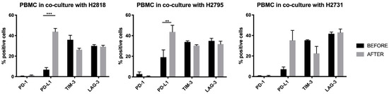 IC expression profile on PBMC before and after allogeneic co-cultures with MPM tumor cells. PBMC were placed in co-culture with tumor cells in a six well plate at an E:T ratio of 20:1. Flow cytometry was used to look at the expression of programmed death-1 (PD-1), programmed death ligand-1 (PD-L1), T-cell immunoglobulin mucin-3 (TIM-3), and lymphocyte activation gene-3 (LAG-3) before and 72 h after allogeneic co-cultures. The experiments were repeated three times with three different PBMC donors (n = 3). Error bars represent the standard deviation. ** p < 0.01, *** p < 0.001: significant difference in IC expression.