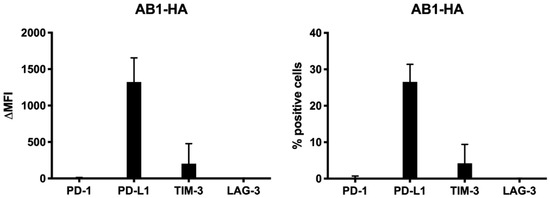 IC expression on the murine AB1-HA cell line. Flow cytometry was used to look at the expression of PD-1, PD-L1, TIM-3, and LAG-3 before subcutaneous (s.c.) injection in vivo. Analyses were repeated three times at different time points. Error bars represent the standard deviation.