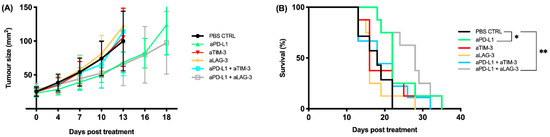 We observed a delay in tumor growth for anti PD-L1 and anti PD-L1 + anti LAG-3 treatment when compared to our PBS control group, though not statistically significant (Figure 8A). When looking at the Kaplan–Meier curve, a statistically significant survival benefit was observed for those same treatments in comparison to the PBS control (Figure 8B) (PD-L1 vs. PBS, p = 0.03; PD-L1 + LAG-3 vs. PBS, p = 0.003).