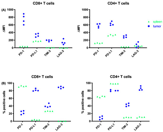 Based on the differences in mean fluorescence intensity (ΔMFI), we observed higher expression for all ICs on tumor resident CD4+ and CD8+ TILs relative to the spleen (Figure 9A). When looking at the percentages of positive cells we clearly saw that more CD8+ effector T cells that express PD-L1 and LAG-3 were found in the tumor compared to the spleen. The same observation was made for LAG-3 expression on CD4+ T helper cells in the tumor (Figure 9B). Though a higher intensity of PD-1 expression was found on TILs, only a low percentage of cells were positive. More TILs expressed TIM-3 at a higher intensity compared to T cells in the spleen, though the percentages of TIM3+ TILs were remarkably lower than PD-L1+ and LAG-3+ TILs (Figure 9B).