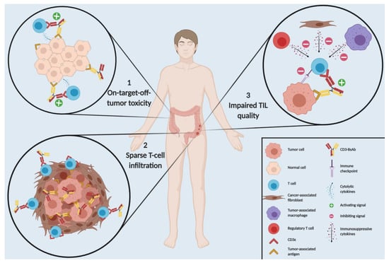 The observation that CD3-BsAbs seem more efficacious in hematological malignancies than in solid tumors can be attributed to several challenges that are specific to solid tumors. The first hurdle is on-target off-tumor toxicities, as these seem less forgiving for TAAs selected for solid tumor targeting, when compared to hematologic TAAs [76]. In the case of hematological cancers, the temporary depletion of B cells or myeloid subsets is reversible, as long as hematopoietic stem cells are not targeted, allowing replenishment of the blood pool. However, solid tumor TAAs are often also expressed on tissues of healthy organs, which can lead to immune pathology and organ failure with potential fatality, as shown in a preclinical mouse study using a CD3-BsAb targeting EGFR [75]. Critical selection of a tumor-specific TAA is thus crucial.