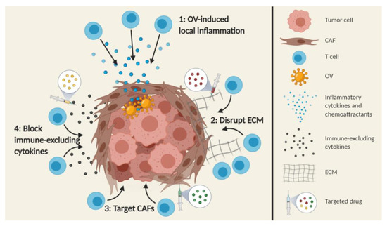 Immune-excluded tumors have T cells surrounding the tumor, but penetration into tumor beds is hindered by physical barriers or soluble factors. Efforts to improve therapy efficacy in these types of tumors should therefore focus on removing these obstructions. The physical barrier is mainly formed by ECM structures, which forces T cells to move along areas of increased stiffness instead of following the chemokine gradient in a process called haptotaxis [135]. This barrier consists of proteoglycans and fibrous proteins such as collagen, elastin and laminin, which are mainly produced by CAFs, but also by tumor cells and stellate cells [135,136]. The ECM could be targeted by the direct destruction of ECM components, such as collagen and hyaluronic acid (HA), a process which is also studied in the context of chemotherapeutic drug delivery to the tumor [137,138,139]. Guan et al. used hyaluronidase to break down HA, which increased the infiltration of tumor-specific T cells and greatly improved treatment efficacy in a B16.OVA melanoma mouse model [140]. Not only ECM components, but also their cellular producers could be targeted. CAFs are the major producers of ECM products and highly express fibroblast activation protein (FAP), which constitutes an attractive target for immunotherapy. In several mouse tumor models, T-cell infiltration was increased upon CAF targeting using DNA vaccines or fibrosis inhibitors [141,142,143]. OV encoding a CD3-BsAb targeting FAP was elegantly used in several studies to kill CAFs and simultaneously enhance T-cell infiltration [144,145,146].