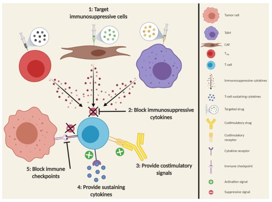 Apart from creating a physical barrier, CAFs can also influence T-cell infiltration by various secreted molecules [147]. CAFs are the major source of the chemokine CXCL12, which has been implicated to mediate T-cell exclusion in solid tumors [148]. The inhibition of CXCL12 or its receptor CXCR4 resulted in increased T-cell infiltration and rendered tumors vulnerable towards checkpoint inhibition therapy in mouse models for pancreatic and colorectal cancer [148,149]. Furthermore, TGF-β has been implicated in hampering T-cell infiltration. This immunosuppressive cytokine is produced by CAFs, but also many other cells, including Tregs and M2 macrophages [147]. Similar to CXCL12 signaling inhibition, blocking TGF-β signaling resulted in more T-cell infiltration and increased sensitivity to checkpoint inhibition therapy in multiple mouse models for breast cancer and colorectal cancer [150,151,152]. Post-translational modifications of secreted factors in the TME can also affect T-cell attraction, as was reported for CCL2 [153]. Nitrification of CCL2 by reactive nitrogen species (RNS) in the TME resulted in T cells being stuck in the stroma surrounding the tumor cells. The inhibition of RNS production greatly improved T-cell infiltration in several mouse tumor models and thereby improved survival as a monotherapy or in combination with adoptive cell transfer. An overview of solutions to overcome sparse T-cell infiltration is shown in Figure 3.