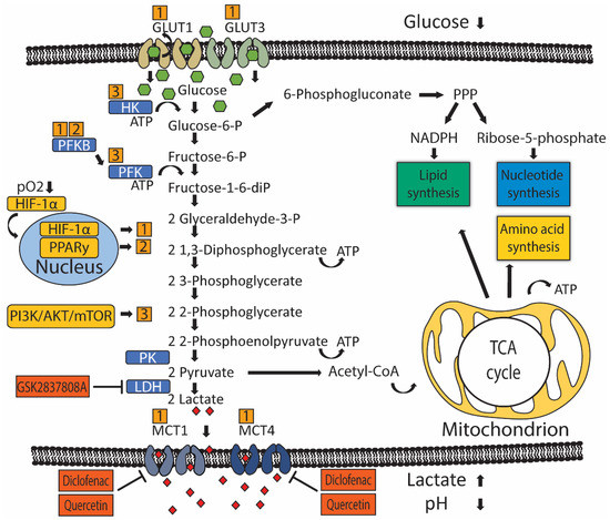 Metabolic reprogramming of glucose metabolism in UC. Oxygen-dependent hypoxia-inducible factor 1 alpha (HIF-1α) and oxygen-independent PI3K/AKT/mTOR and PPARy signaling (yellow boxes) drive metabolic reprogramming in UC by controlling the activity of rate-limiting enzymes (blue boxes) or transporters. Numbers (orange boxes) indicate which gene drives activation of particular rate-limiting enzymes or transporters. Glucose is imported into the cell by glucose transporters (GLUT) 1 and 3. Glycolysis starts with phosphorylation of glucose by hexokinase (HK) to glucose-6-phosphate, preventing glucose from diffusing outside the cell. Glucose-6-phosphate can be dehydrogenated by glucose-6-phosphate dehydrogenase (G6PD) to enter the pentose phosphate cycle (PPP) to produce pentoses like ribose-5-phosphate required for the synthesis of nucleotides and NADPH, which is necessary for reductive processes such as lipid biosynthesis. If glucose-6-phosphate is not oxidized by G6PD, glucose-6-phosphate is isomerized by phosphoglucose isomerase/phosphoglucoisomerase (PGI) to fructose-6-phosphate. Next, phosphofructokinase (PFK) catalyzes the phosphorylation of fructose-6-phosphate to fructose-1,6-biphosphate, which irreversibly channels the glucose-derived metabolite into the glycolytic pathway towards phosphoenolpyruvate. At the end of the glycolytic pathway, pyruvate kinase (PK) catalyzes the dephosphorylation of phosphoenolpyruvate (PEP) to produce one pyruvate and one ATP molecule. Pyruvate is then metabolized into lactate-by-lactate dehydrogenase (LDH). Lactate is transported outside the cell by monocarboxylate transporters (MCT) 1 and 2, which leads to an increased concentration of extracellular lactate and an acidified tumor micro-environment. Pyruvate can also be metabolized into acetyl coenzyme A (acetyl-CoA), which participates in the tricarboxylic acid (TCA) cycle inside mitochondria to give rise to ATP and intermediary metabolites that are required for lipid and amino acid biogenesis.