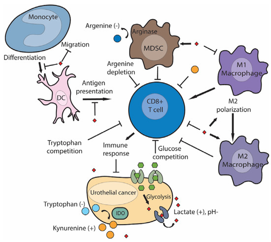 How urothelial cancer metabolism impacts immune cells in tumor microenvironment (TME). Urothelial cancer creates an acidic TME deprived of glucose, tryptophan, and arginine, whereas concentrations of immune-suppressive molecules, such as lactate and kynurenine, are increased. Excessive lactate in the TME inhibits the tumor immune response by (1) polarization of macrophages to a suppressive M2 phenotype, (2) inhibition of monocyte migration and differentiation into dendritic cells (DC), thereby inhibiting antigen presentation and subsequent T cell activation, (3) by stimulating immune-suppressive myeloid-derived progenitor cells (MDSCs) to breakdown immune-stimulatory arginine, or (4) through direct inhibition of CD8+ T cell function by lactate. The T-cell-mediated immune response is also directly inhibited by tumor-produced kynurenine and indirectly through tumor-induced tryptophan and glucose shortage.