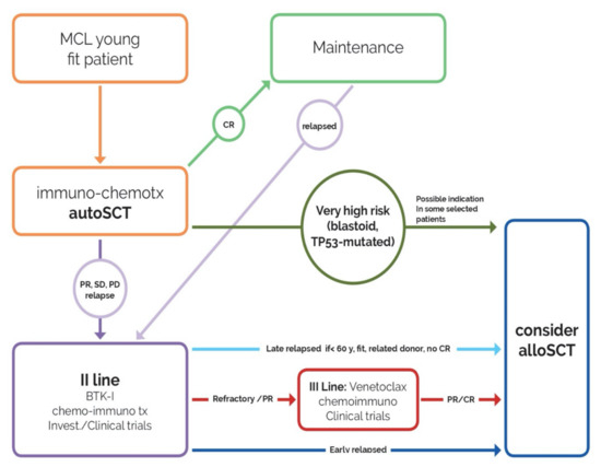 Mantle cell lymphoma (MCL) is an uncommon lymphoproliferative disorder accounting for 6–7% of non-Hodgkin lymphomas and is characterized by the translocation of the Cyclin D1 gene [1]. This lymphoma subtype is more frequent among males and is typical of advanced age with a peak incidence in the seventh decade. MCL is considered an incurable disease showing a typical relapsing remitting clinical course and a median survival time of approximately 5 years. The Mantle cell International Prognostic index (MIPI) can be used to identify three risk groups with a different five-year overall survival (OS) of 60%, 35%, and 20%, for the low, intermediate and high risk group, respectively; additionally, high Ki67 proliferation index and TP53 mutations are adverse prognostic findings and could imply the need for adapted treatment [2,3,4]. Survival of MCL has evolved over the past decades since immunochemotherapy regimens became available. The choice of optimal treatment is based on the aggressiveness of the disease, and on patient features (including age, performance status, and comorbidities). Treatment can be postponed in patients without symptoms, with leukemic non-nodal disease that usually carry hypermutated Immunoglobulin heavy chain (IGH) genes, with SOX11 negative disease, and without a complex karyotype.