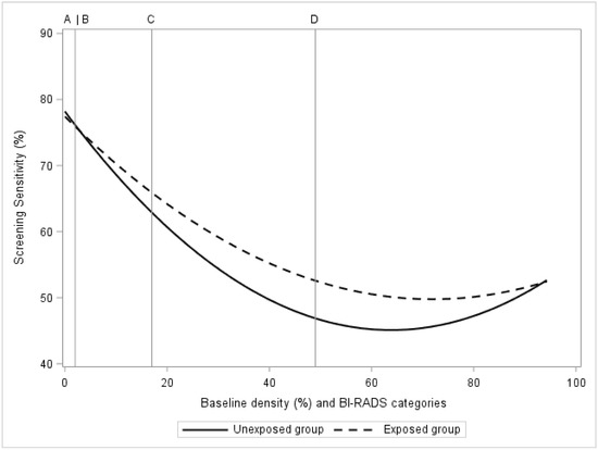 Screening sensitivity in the unexposed and exposed groups by BI-RADS classification of mammographic breast density at baseline.