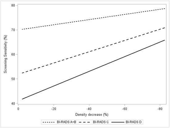 A logistic model was used to estimate the screening sensitivity dependency on the baseline breast density of the study participants [21]. The model was used to predict screening sensitivity in the exposed group. The probability of identifying breast cancers at increased screening sensitivity per percentage density decrease was estimated based on the model. The percentages of screening sensitivity changes were presented by the degree of density response.