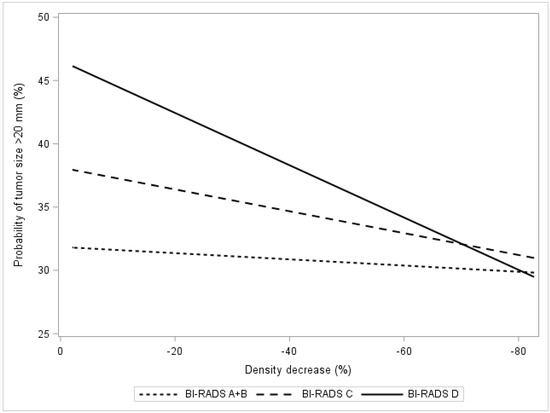 Figure 3 presents the estimated probability of having an invasive cancer >20 mm in relation to the estimated relative density decrease in breast density after exposure to tamoxifen. A trend (p < 0.001) of lower probabilities of >20 mm invasive tumors was observed in women with BI-RADS C and D densities (Figure 3, Table 4). Specifically, in this group of women with dense breasts, the probability of having a >20 mm invasive tumor was reduced by 4% (p < 0.01) if the reduction in breast density was ≥20% following tamoxifen exposure.