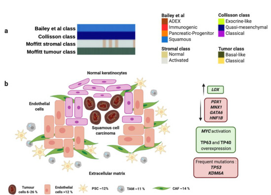 Squamous molecular profile and microenvironment. (a) Squamous subtype is associated with specific histological characteristics such as squamous and adenosquamous carcinomas. (b) Squamous subtype proposed by Bailey et al., matches perfectly with "quasi-mesenchymal" tumor subtype proposed by Collisson et al., and “basal-like” tumors and “activated” stroma subtypes proposed by Moffitt et al. Green boxes contain upregulated significant factors and activated pathways associated to squamous molecular subtype. Red boxes contain downregulated significant factors (up) and most common mutations found in squamous molecular subtype (down). Percentage of each subcellular population has been obtained from Peng et al., [86]. Abbreviations: TAM: Tumor-associated macrophage; CAF: Cancer-associated fibroblast; PSC: Pancreatic stellate cell.