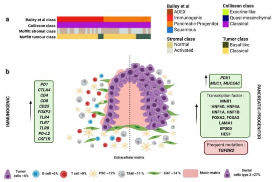 Immunogenic and progenitor molecular profiles and their microenvironment. (a) Both subtypes proposed by Bailey et al., match perfectly with “classical” tumor subtype proposed by Collisson et al., and “classical” tumor subtype proposed by Moffitt et al. (b) Both subtypes share the same histology derived from premalignant lesions like mucinous non-cystic adenocarcinomas and intraductal papillary mucinous neoplasms (IPMN) characterized by high mucin production. Dotted line separates schematic representation of two subtypes. Green boxes contain upregulated significant factors associated to each subtype. Red box contains the most characteristic gene mutation in progenitor molecular subtype. Pink color represents mucin production. Percentage of each subcellular population has been obtained from Peng et al., [86]. Abbreviations: TAM: tumor-associated macrophage; CAF: cancer-associated fibroblast; PSC: pancreatic stellate cell.4. Microenvironment of ADEX Subtype.