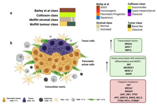ADEX molecular profile and microenvironment. (a) ADEX subtype proposed by Bailey et al., matches perfectly with “exocrine-like” subtype proposed by Collisson et al., and most of “normal stroma” subtype cases analyzed by Moffitt et al. (b) ADEX molecular subtype is associated with the rare acinar histology. Green boxes contain upregulated transcription factors and other genes involved in ADEX molecular subtype. Red box contains genes commonly mutated in ADEX. Percentage of each subcellular population has been obtained from Peng et al., [86]. Abbreviations: TAM: tumor-associated macrophage; CAF: cancer-associated fibroblast; PSC: pancreatic stellate cell; MODY: maturity onset diabetes of the young.