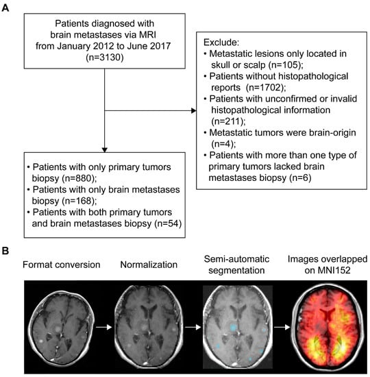 A total of 3130 patients initially diagnosed with BMs via contrast-enhanced T1 weighted MRI (CE-T1WI) at our institution from January 2012 to June 2017 were reviewed. Among the 3130 patients, 105 were excluded from the study because the metastatic lesions were located only in the skull or scalp. Histopathological reports for the remaining 3025 patients were extracted from a database. Matched records for 1323 patients were found and were categorized based on primary tumors and BMs biopsies. Patients who met the following criteria were included: (1) patients with a BMs biopsy, with or without a biopsy of primary malignancies, and (2) patients with only a biopsy of primary malignancies (due to surgical contraindications for BMs). Patients who met the following criteria were excluded: (1) histopathological data were inconclusive or invalid, or (2) BMs originated from the brain, or (3) patients had more than one type of primaries but lacked a BMs biopsy. A total of 1102 patients were analyzed further after strict review and differential diagnosis of MRI by a senior neuroradiologist (B.J.). Figure 1A shows a schematic of the selection procedure. The data presented in this study are available on request from the corresponding author.