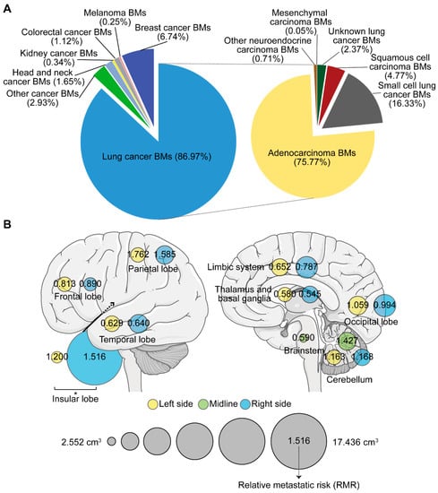 The number, volume, and relative metastatic risk of brain metastases (BMs). (A) Composite pie charts indicate the percentage of BMs according to different primary malignancies. The right chart represents the percentage of BMs from different subtypes of lung cancer. (B) Schematics showing the average volume of the single lesion of BMs on different sides of distinct brain lobes (circle size), and the corresponding relative metastatic risk (RMR) after normalization to the volume of the brain lobe. BMs refer to brain metastases. *: p < 0.05.