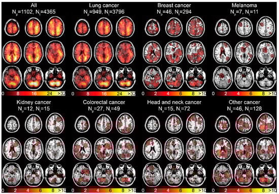 - Schroeder, T.; Bittrich, P.; Kuhne, J.F.; Noebel, C.; Leischner, H.; Fiehler, J.; Schroeder, J.; Schoen, G.; Gellißen, S. Mapping distribution of brain metastases: Does the primary tumor matter? J. Neurooncol. 2020, 147, 229–235. [Google Scholar] [CrossRef]