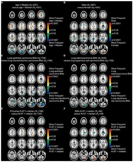 In addition, BMs from primary malignancies that expressed Ki-67 (a marker of tumor proliferation) ≥ the median level (35%) showed significant localization in the left parietal and occipital lobes and the infratentorial regions (Figure 4E). BMs with Ki-67 ≥ the median (45%) showed significant localization in the left cerebellum (Figure 4F).