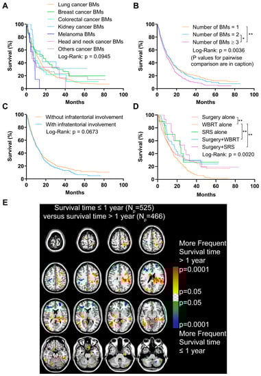Analyses of the overall survival (OS) and analysis of differential involvement (ADIFFI) of survival-related localization of BMs. (A) OS analysis comparing patients with BMs originated from different primary malignancies. (B) OS analysis comparing patients with 1, 2, and ≥3 BMs (n = 1 vs. n = 2, p = 0.605; n = 1 vs. n ≥ 3, p = 0.0010; n = 2 vs. n ≥ 3, p = 0.0347). (C) OS analysis comparing patients with or without infratentorial involvement of BMs. (D) OS analysis comparing patients who received different treatments (surgery alone vs. WBRT alone, p = 0.005; surgery plus WBRT vs. WBRT alone, p = 0.006; surgery plus SRS vs. WBRT alone, p = 0.005). (E) p-value heatmap constructed by ADIFFI displayed BMs cluster predominance when comparing patients with OS ≤1 year with OS >1 year. BMs refer to brain metastases. Np refers to the number of patients. WBRT refers to whole-brain radiotherapy. SRS refers to stereotactic radiosurgery. *: p < 0.05 and **: p < 0.01.