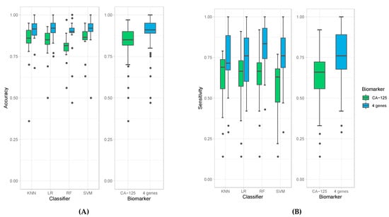 The results obtained from the four classification models used in these experiments are comparable but with some differences. All of them derive high accuracies in all experiments, especially when using the four-protein panel (e.g., all median accuracies are over 0.9). Among all classification models, random forest produced the highest sensitivity; however, it resulted in the lowest specificity (Figure 1B,C). Random forest models also produced the highest median value of NPV (Figure 1E) and AUC (Figure 1F). The highest specificity and PPV are achieved with logistic regression (Figure 1D). Due to these variations amongst classification models, we report the average calculations of the classification models to obtain the most unbiased, representative and reliable data in terms of comparing the four-protein panel versus CA-125 alone.