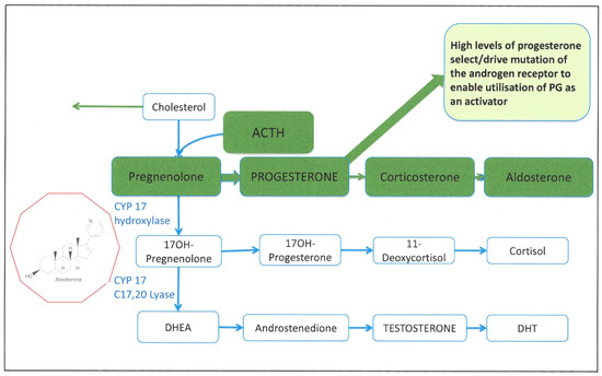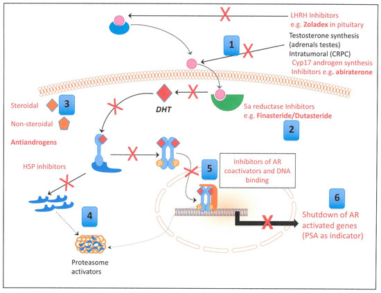 | Testosterone activation to dihydrotestosterone (DHT) | Steroid 5-alpha reductase | Dutasteride/Finasteride | Switch in 5aR isotype or use of testosterone/adrenal androgens | [25,26] |
