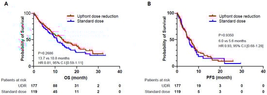 Kaplan-Meier curves for overall survival (OS) and progression free survival (PFS) between the standard dose group and the group with upfront dose reduction (UDR). (A) overall survival (B) progression free survival. CI, confidence interval; HR, hazard ratio.