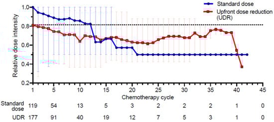 Changes in relative dose intensity (RDI) of the standard dose and UDR groups. The dotted line demonstrates each mean RDI chemotherapy cycle, and the error bar demonstrates RDI ranges.