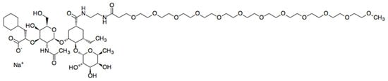 Uproleselan (Kd = 0.46 µM) mainly inhibits E-selectin (IC50 = 1.75 µM), but also weakly inhibits L-selectin (IC50 = 2.9 µM) and P-selectin (>10 µM). Uproleselan’s chemical formula C60H108N3NaO27 (molecular weight of 1325.70679 g/mol) is demonstrated in Figure 1.