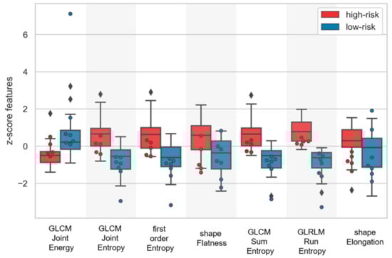 Figure 1. Standardized dose features for patients as stratified by the best performing r-Cox model (i.e., highest validation C-index) according to the risk (high in red, low in blue) of showing an adverse local control. The model was re-trained on the whole training set (80% dataset), from which the stratification cut-off was estimated, and tested on the hold-out test set (20% dataset). Boxplots refer to re-training data, whereas the overlaid points refer to test data.