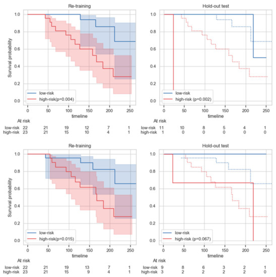 As for evaluating the clinical applicability of the proposed procedure, the stratification cut-off was set to be the median value of the model’s output in the re-training set, and it was applied to both re-training and test data. The estimated survival curves (i.e., Kaplan-Meier survival curves, Section 4.4.) were compared using log-rank tests, setting the significance at α = 0.05. To account for multiple testing, a Bonferroni correction (n = 6) was applied to each model, thus leading to a corrected α = 0.0083.