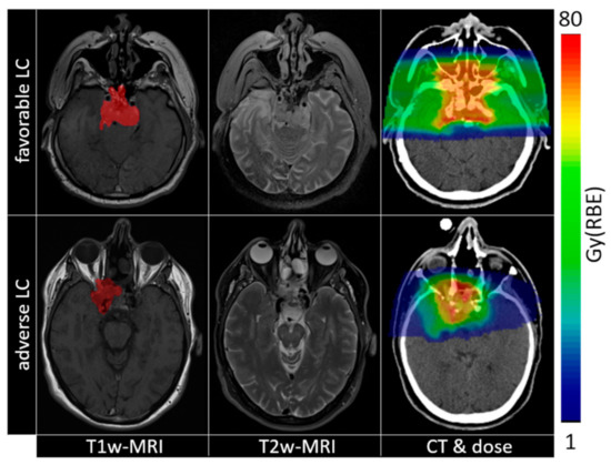 Imaging (from left to right: T1w-MRI, T2w-MRI, CT) and dose maps (overlaid to CT) for patients with opposite local control evaluation (top row favourable LC, bottom row adverse LC). Tumour contours are shown as red overlays on T1w-MRI images.