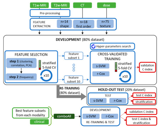 Each modality (T1w-MRI, T2w-MRI, CT, dose, clinical) was evaluated separately. Then, the single-modality signatures that were associated to the best validation C-index, within each modality, were retained; they were combined into a multi-parametric feature set, to which clinical features were added (comboAll); and the development procedure was repeated (supplementary materials, Section S4).