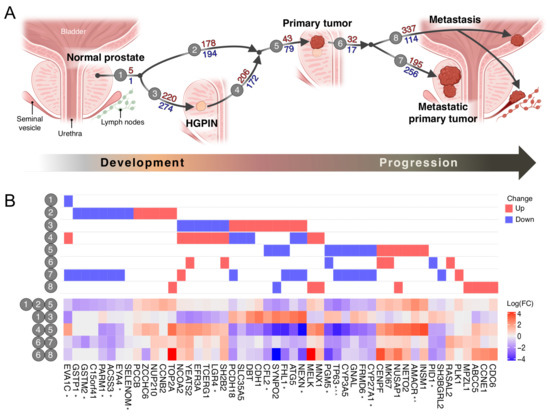 The transcriptomic landscape of prostate cancer development and progression. (A) Biological comparisons between tissue types were performed and the top 500 genes were used to assemble the molecular alteration map (MAM) of prostate transcriptional space (Methods). Circled numbers 1–8 indicate individual PC development or progression stages presented in the context of the prostate gland and surrounding organs. The number of up- and down-regulated genes between stages are indicated by red and blue text, respectively. (B) Diagram (top) and heatmap (bottom) illustrating the direction and fold-change (FC), respectively, of expression alterations for selected novel or biologically relevant genes across individual MAM stages (top) and biological comparisons (bottom). The FC values are presented in log2 scale. * in silico prediction validated in a clinical cohort (p-value < 0.05); ^ positive control; ^^ negative control.