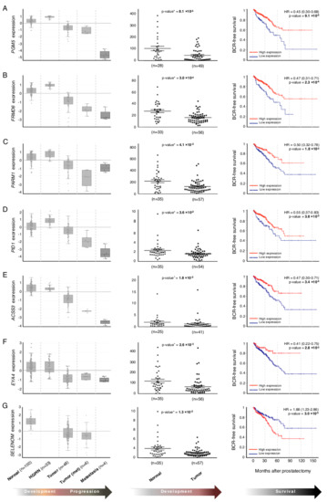 Genes identified by the integrative analysis validate in a clinical cohort. Predicted in silico expression patterns across PC development and progression stages for 7 experimentally validated genes (left panels), including (A) PGM5, (B) FRMD6, (C) PARM1, (D) PID1, (E) ACSS3, (F) EVA4 and (G) SELENOM, which were validated in the clinical cohort (middle panels) and stratified TCGA patients into prognostic groups based on low vs. high expression levels (right panels). The in silico expression profiles are based on combined data from 5 Affymetrix HG U133 Plus 2.0 datasets containing 191 samples representing all biological groups used for PC MAM construction. Only genes previously unreported in PC are shown. ^ Mann-Whitney; * unpaired t-test; HR: hazard ratio; BCR: biochemical relapse.
