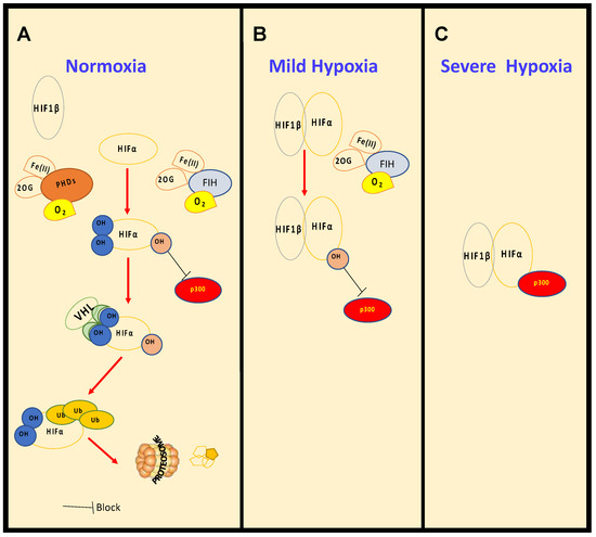 Regulation of HIF levels and activity in normoxia and hypoxia. Under normal oxygen conditions, (A), normoxia, HIF-α is constantly hydroxylated by PHDs and FIH. PHD-mediated hydroxylation increases binding affinity with the tumour suppressor VHL, which promotes ubiquitination and degradation by the proteosome. As oxygen levels decrease, in mild hypoxia (15–1% O2) (B), PHDs are inhibited, HIF-α is stabilised, though still hydroxylated by FIH, binds to HIF-1β and is able to induce transcription of certain target genes. With further reduction in oxygen levels, in severe hypoxia (<1% O2) (C), FIH is also inhibited and HIF is able to become fully active by the recruitment of co-activators such as p300.