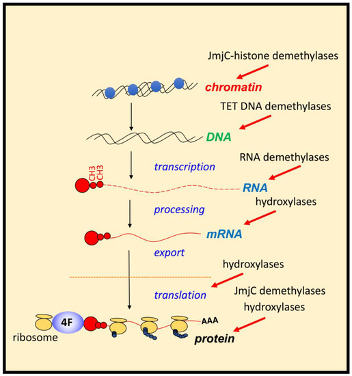 Biochemical characterisation revealed that PHDs have low affinity for molecular oxygen. Low affinity for molecular oxygen signifies that when oxygen availability is reduced, these enzymes are quickly inhibited, leading to HIF stabilisation and activation of target genes. PHD inhibition in hypoxia has resulted in them being termed molecular oxygen sensors in the cell [12]. Additionally, many more 2-OGDs have been identified, most of which act independently of HIF but play a role in coordinating the cellular response to hypoxia. These include Factor Inhibiting HIF1 (FIH), Jumonji C (JmjC)-domain containing demethylases (JmjC demethylases) (which demethylate both histones and non-histone proteins), Ten-Eleven Translocation (TET) enzymes (mediators of DNA-demethylation), and RNA-demethylases (reported in vitro for 2-ODGs are shown is Table 1 and Supplementary Table S1). Given the function of some of these enzymes, it is conceivable that hypoxia could influence all aspects of gene expression, from chromatin structure and epigenetics to RNA biology, translation and protein turnover (Figure 2). This perfectly equips the cell when faced with hypoxia. Under such conditions, the cell must make a coordinated effort to allow for restoration of oxygen homeostasis, while reducing energy expenditure if it is to survive.